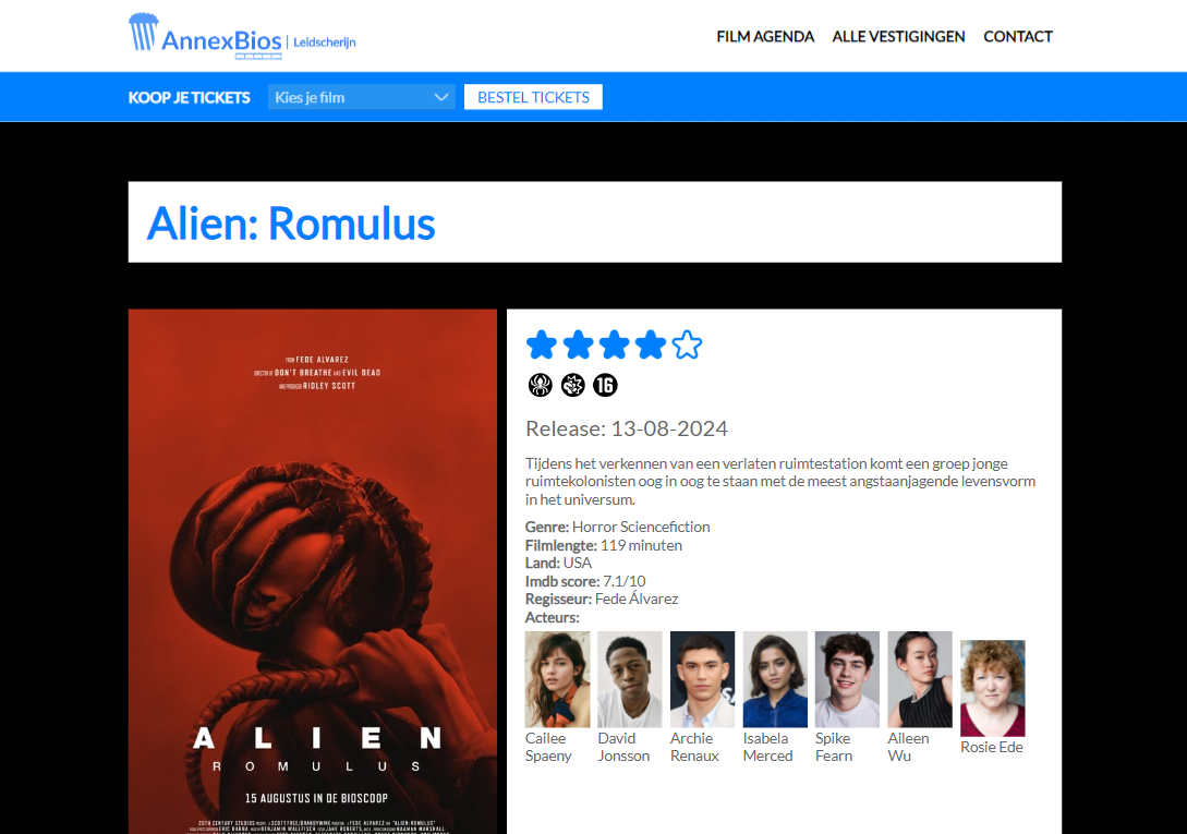 - Homepagina – Met algemene informatie over de bioscoop en een overzicht van de nieuwste films.