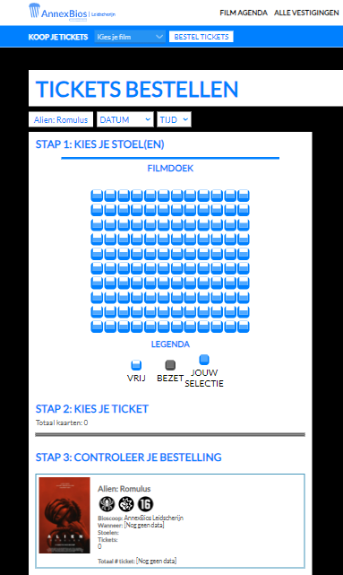 - Bestelpagina – Op deze pagina kies je je stoelen, wordt de ticketprijs automatisch aangepast op basis van leeftijd, en kun je een betaalmethode kiezen.