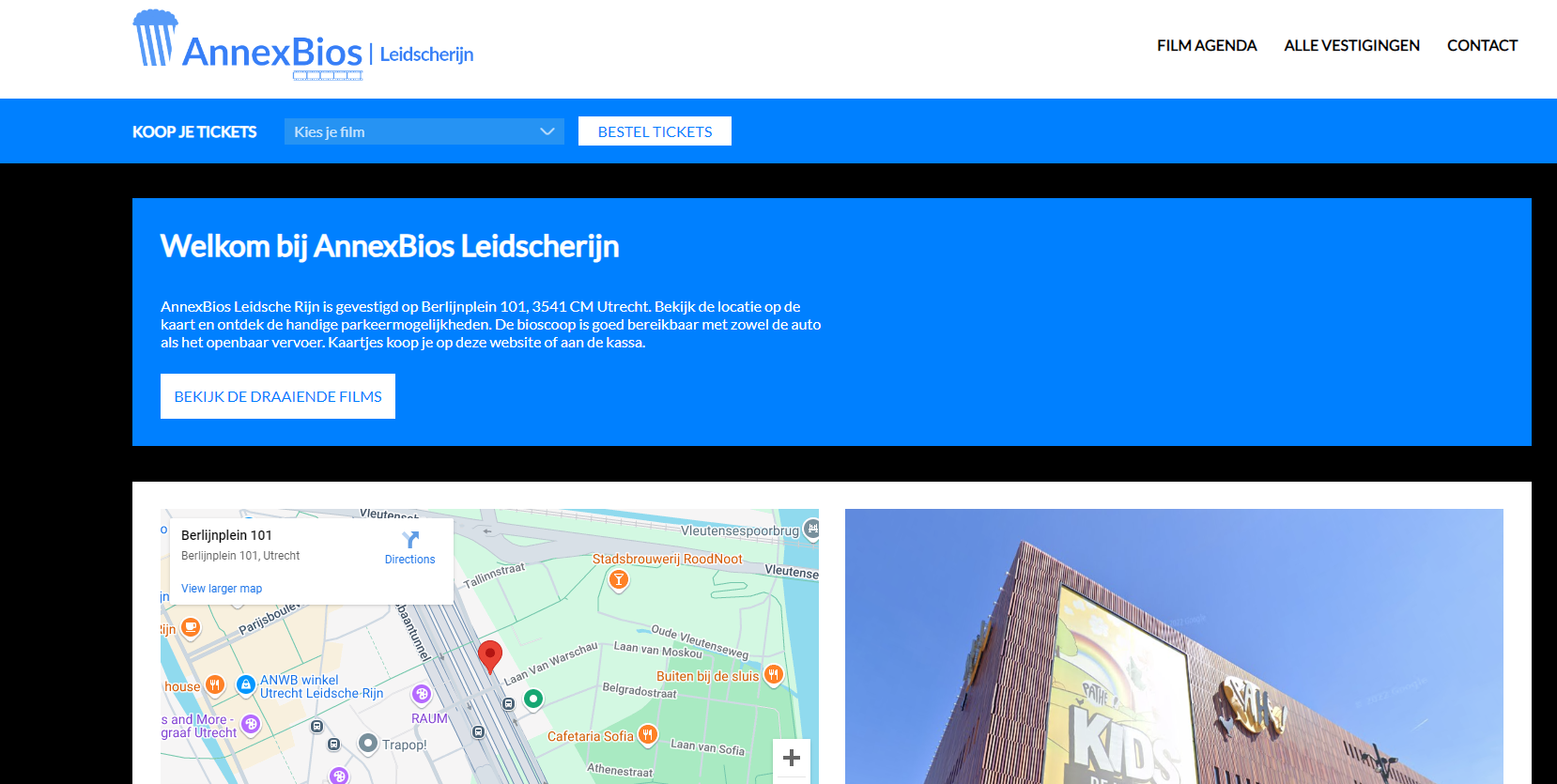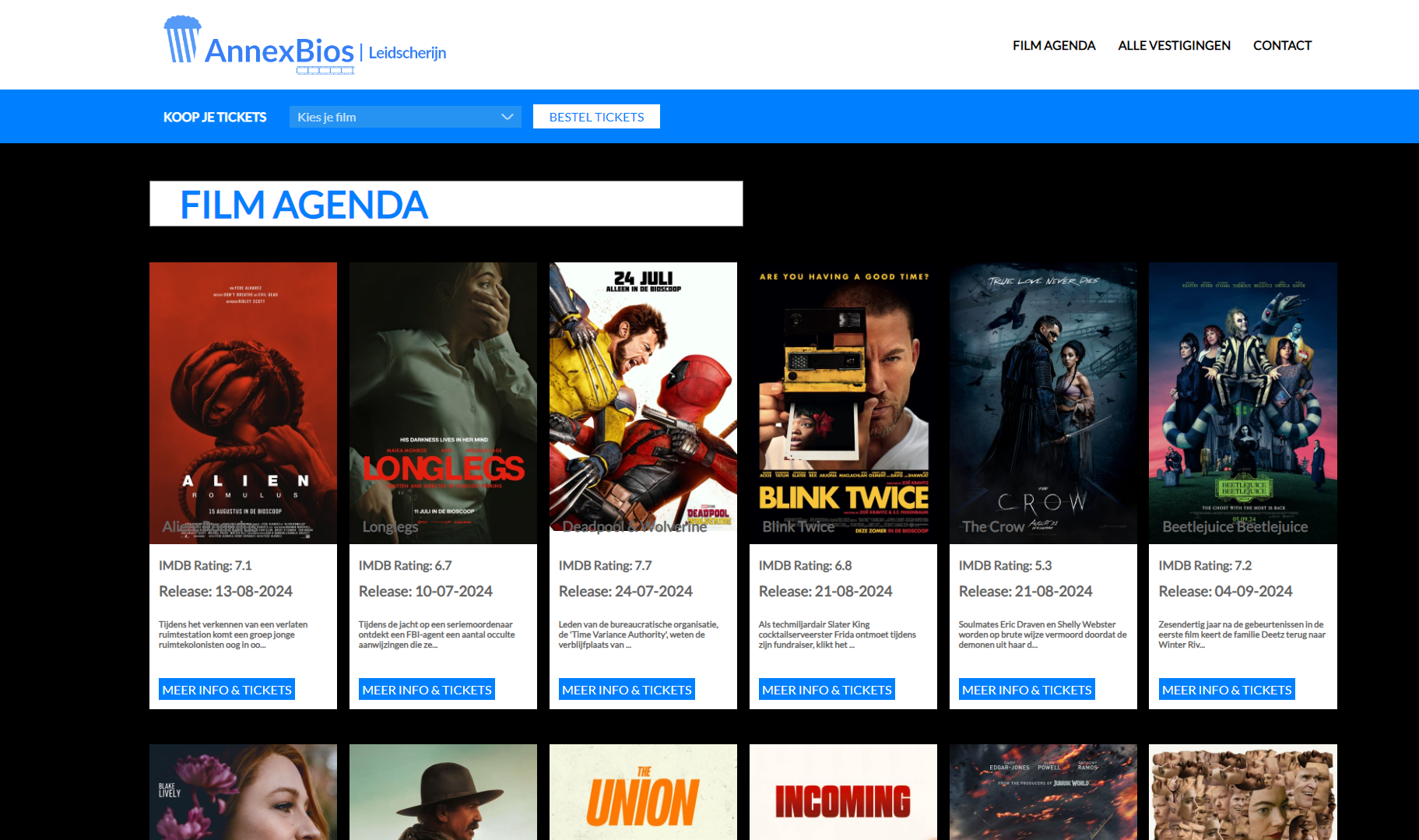 Voor deze opdracht hebben ik en mijn groep een website ontworpen voor AnnexBios, een bioscoop in Leidsche Rijn. De website is bedoeld om bezoekers informatie te geven over films en om gemakkelijk kaartjes te kunnen bestellen. We werkten met een blauw thema, passend bij de huisstijl van de bioscoop.